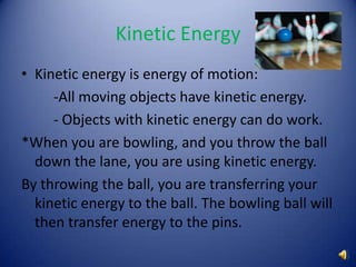 Energy can exist in two main forms - kinetic energy, which is the energy of motion, and potential energy, which is the energy due to an object's position or shape. Kinetic energy depends on an object's mass and speed, and can be calculated using the equation KE=1/2mv^2. Potential energy includes gravitational potential energy, which depends on an object's weight and height above the ground and can be calculated as GPE=mgh. Mechanical energy represents the total energy of an object, including both its kinetic energy and potential energy.