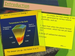 This document outlines geothermal energy sources and their uses. Geothermal reservoirs contain hot water and steam trapped in permeable rocks, which can be extracted to generate electricity or used directly for heating. Electricity is typically generated using flash steam or binary cycle power plants. While the initial investment is high, geothermal electricity generation costs become competitive over time and the fuel source is free and sustainable. India has significant untapped geothermal potential across its Himalayan and coastal regions.