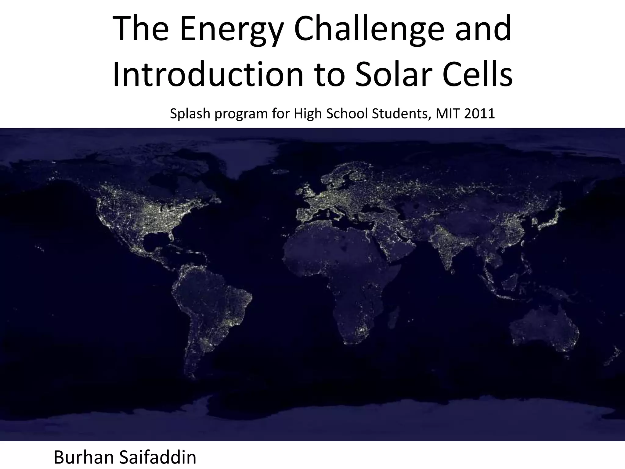 This document provides an introduction to solar cells and discusses the global energy challenge. It outlines how solar cells work and notes that the sun is the primary energy source on Earth. The document discusses how meeting increasing global energy demand in a sustainable way is a challenge and introduces organic photovoltaics as a potential solution. It provides a basic overview of organic PV technology and its potential advantages over traditional silicon-based solar cells.