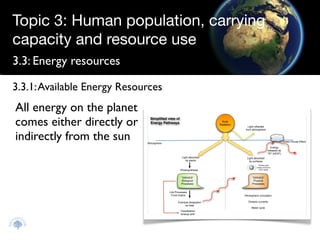 This document discusses human use of energy resources. It begins by explaining that all energy on Earth ultimately comes from the sun. Energy resources are classified as either renewable (e.g. solar, wind) or non-renewable (e.g. fossil fuels, nuclear). The document then evaluates factors like economics, environment, and social impacts that must be considered when assessing different energy options. It provides examples by discussing advantages and disadvantages of oil and solar power. Finally, it examines how availability, costs, technology, and politics influence a nation like France's choice of energy resources over time.
