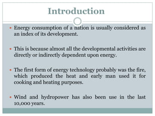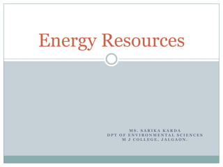 This document discusses various energy resources including renewable and non-renewable sources. It provides details on solar energy, wind energy, hydropower, and tidal power. Some key points made are: