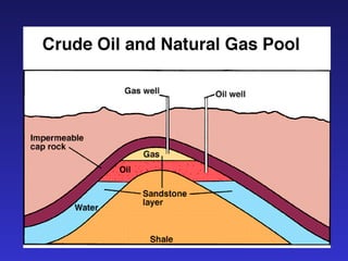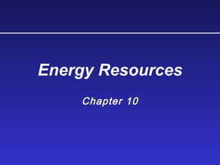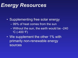 This document discusses various energy resources including renewable and non-renewable sources. It notes that 16% of energy comes from renewable sources such as solar, wind, water, and biomass while 84% comes from non-renewable sources like oil, natural gas, coal, and nuclear power. It provides details on the formation, extraction or production, uses, and trade-offs of different energy sources. These include discussions of oil and natural gas formation from dead marine organisms, coal formation over millions of years, nuclear fission reactions, and renewable options like solar, wind, hydroelectric, and geothermal energy. The document emphasizes evaluating different energy sources based on factors like availability, yields, costs, environmental impacts, and sustainability
