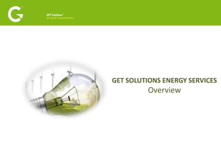 GET Solutions provides an end-to-end energy management service including energy procurement, site operations, data management, carbon reduction, and compliance. Their services aim to reduce customers' energy costs by 30-40% through competitive procurement, bill validation rebates of 3-5%, and additional energy management savings of 8-10%. GET has over 200 agents, 21,000 customers, and £1.2 billion in annual energy procurement. Their full-service approach and proven track record of successful delivery creates strategic alignment to help customers meet energy, environmental, and cost reduction targets.