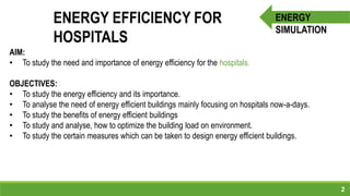 This document discusses energy efficiency in hospitals through building design and operations. It outlines the importance of energy efficiency in hospitals, as energy consumption accounts for a large portion of hospital costs. Designing hospitals to maximize daylight, optimize HVAC and lighting systems, and utilize energy recovery can significantly reduce energy use. Specific measures mentioned include installing efficient LED lighting, optimizing insulation and windows, recovering heat from sterilization processes, and utilizing building automation for HVAC and lighting control. The document emphasizes that improving energy efficiency in hospitals can lower costs while enhancing patient and staff comfort.