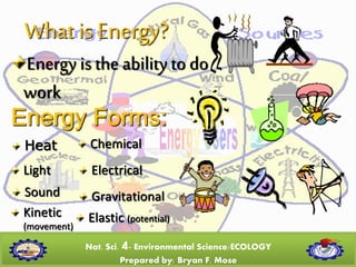 This document is a lecture on energy sources presented by Bryan F. Mose. It defines energy and lists different types of energy sources including renewable and non-renewable sources. Renewable energy sources can be replenished naturally, such as sunlight, wind, water, and biomass. Non-renewable sources such as fossil fuels are limited in supply. The document then discusses various non-renewable energy sources used in the Philippines like oil, natural gas, coal, and their impacts. Other domestic energy sources in the Philippines highlighted include geothermal, hydroelectric, solar and wind energy. Methods for conserving energy are also presented.
