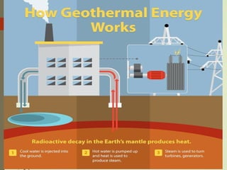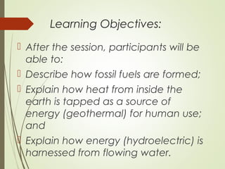 This document discusses different types of energy resources. It describes how fossil fuels like coal and oil are formed from ancient biological materials over millions of years. It also explains how geothermal energy harnesses heat from inside the earth by tapping hot underground water or rock, and how hydroelectric power uses the kinetic energy of moving water through dams and turbines to generate electricity.