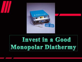 1. The document discusses the history and evolution of energy sources used in laparoscopic surgery, from early monopolar electrocautery to newer bipolar and ultrasonic devices.