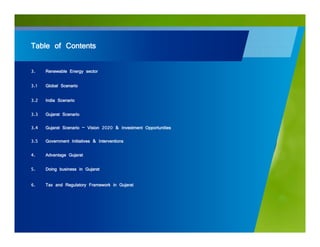 The document discusses the vibrant renewable energy landscape in Gujarat, India, highlighting its transition from power deficiency to surplus through significant investments in wind, solar, and biomass energy. Gujarat currently contributes approximately 15% to India's renewable energy capacity and has ambitious goals to increase its renewable energy share. The state has established a favorable regulatory environment and strategic partnerships to harness its vast potential in renewable resources.