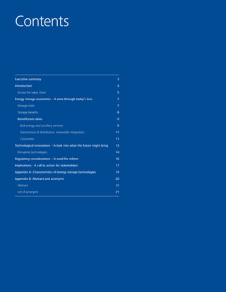 This document provides an overview of energy storage technologies and their potential to transform the power sector. It discusses how energy storage can help integrate renewable energy sources by addressing intermittency issues. A variety of energy storage technologies are described along with their characteristics and applications across the different segments of the power sector value chain. The economics of energy storage technologies are evaluated based on costs and potential benefits. Cost reductions through innovation and the ability to provide multiple stacked services are seen as important factors in developing a favorable business case for energy storage adoption. Regulatory reforms are also highlighted as necessary to fully capture the value that energy storage can provide across the entire power system.