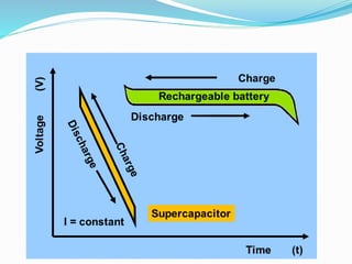 The document discusses the significance of energy storage in transitioning from non-renewable to renewable energy sources, emphasizing the need for improved storage devices. It outlines various types of energy storage technologies including chemical, electrochemical, and thermal methods, highlighting the advantages and disadvantages of supercapacitors and lithium-ion batteries. Furthermore, it details the applications, efficiency, and limitations of these storage methods in providing reliable energy supply.