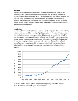 The document discusses the advancements and significance of lithium-ion batteries in electric vehicles (EVs) and hybrid electric vehicles (HEVs), highlighting their environmental benefits and market potential with sales reaching $80 billion annually. It examines various battery technologies, including lead-acid, nickel-metal hydride, and lithium-polymer, while addressing regenerative braking and battery management systems that enhance vehicle efficiency. The report concludes that ongoing technological improvements are making hybrid cars increasingly viable as sustainable transportation alternatives.