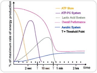 2) Anaerobic glycolysis produces ATP without oxygen through carbohydrate breakdown, lasting 30-120 seconds but producing lactic acid as a byproduct.