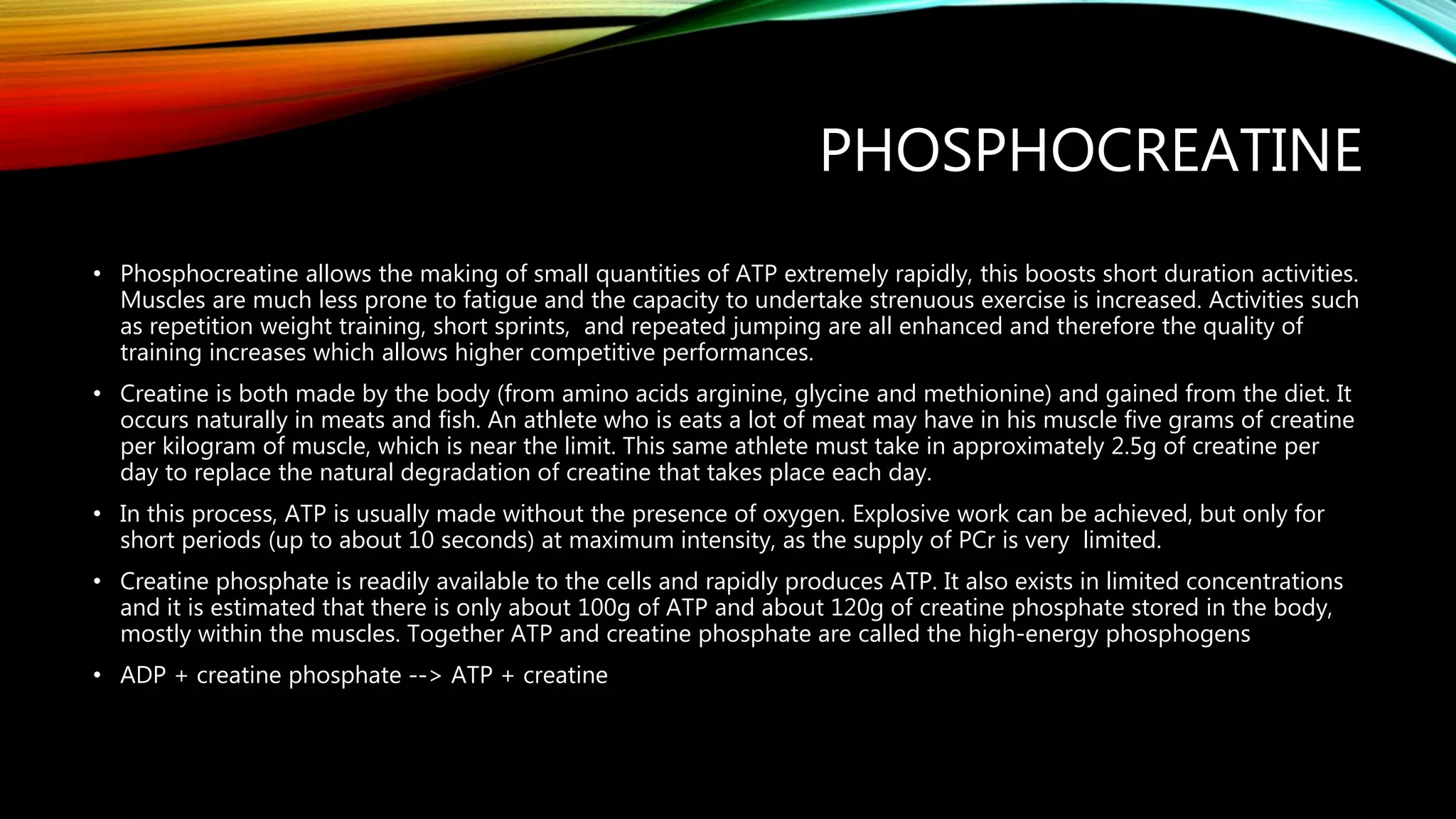 Phosphocreatine allows for rapid production of ATP, boosting performance in high-intensity short-duration activities like sprints and weight training. It exists in limited stores in the body and is replenished through diet and endogenous production. The lactic acid energy system produces ATP anaerobically for up to 90 seconds of maximal work, but lactic acid buildup leads to fatigue. The aerobic system produces ATP slowly through 3 stages, but can sustain low-to-moderate intensity exercise indefinitely due to virtually limitless capacity. The intensity and duration of exercise determines which energy systems are utilized.
