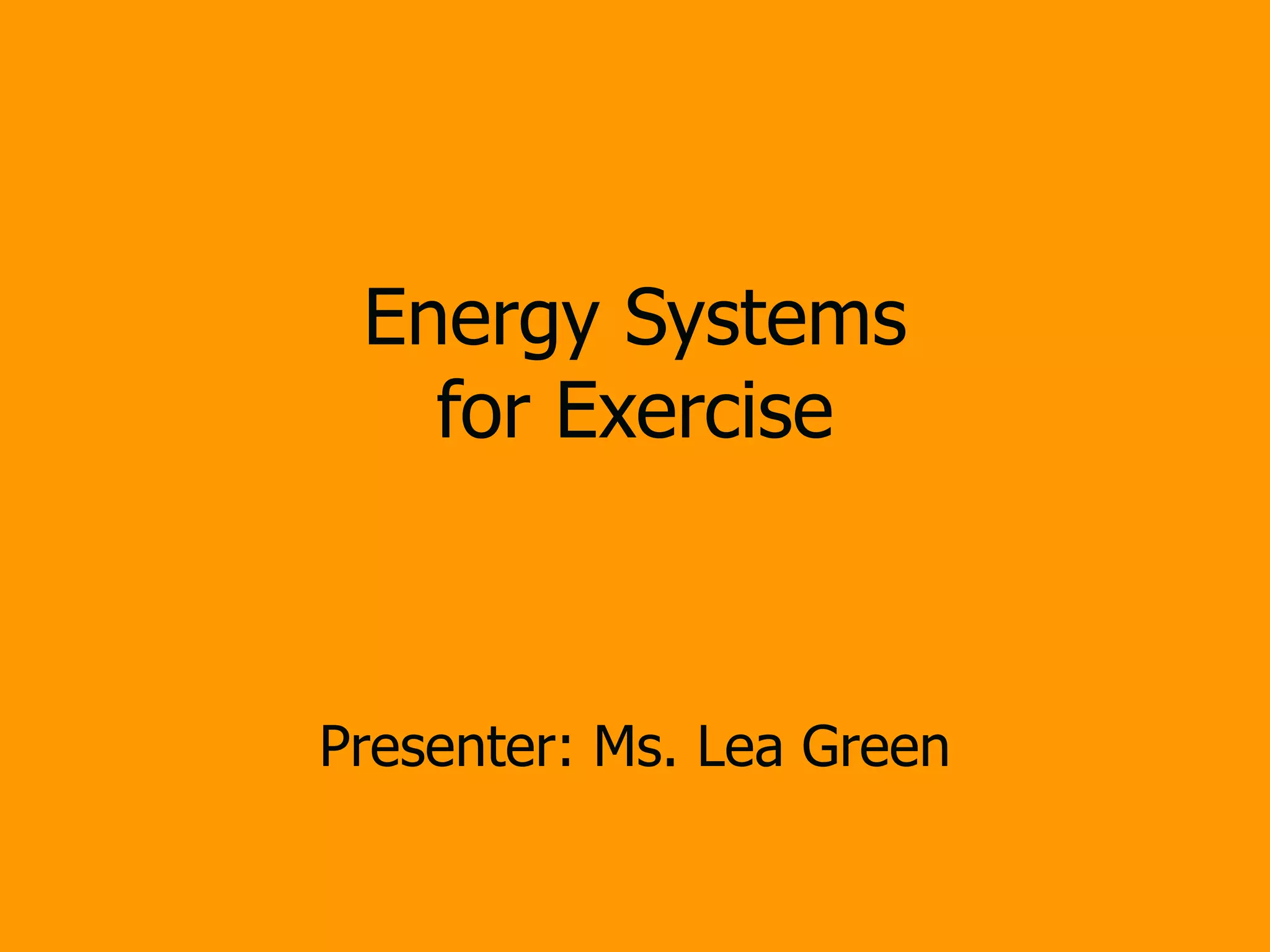 The document summarizes the different energy systems the human body uses to produce energy for physical activity. It discusses the ATP-CP, anaerobic glycolysis, and aerobic energy systems. The ATP-CP system provides energy for bursts of intense activity lasting 2-3 seconds. The anaerobic glycolysis system lasts 2-3 minutes and produces energy without oxygen through breaking down glycogen. The aerobic system provides sustained energy for longer duration activities through oxygen-dependent breakdown of carbohydrates and fats.
