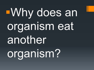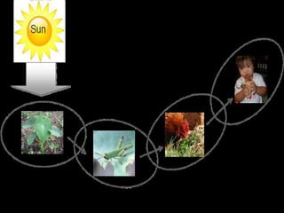 This document discusses energy transfer in ecosystems through food chains, webs, and pyramids. It explains that producers like plants obtain energy through photosynthesis, and consumers obtain energy by eating producers or other consumers. A food chain outlines the sequence of energy transfer from the sun to producers to primary, secondary, and tertiary consumers. Scavengers and decomposers also play roles in recycling nutrients and matter back into the ecosystem.