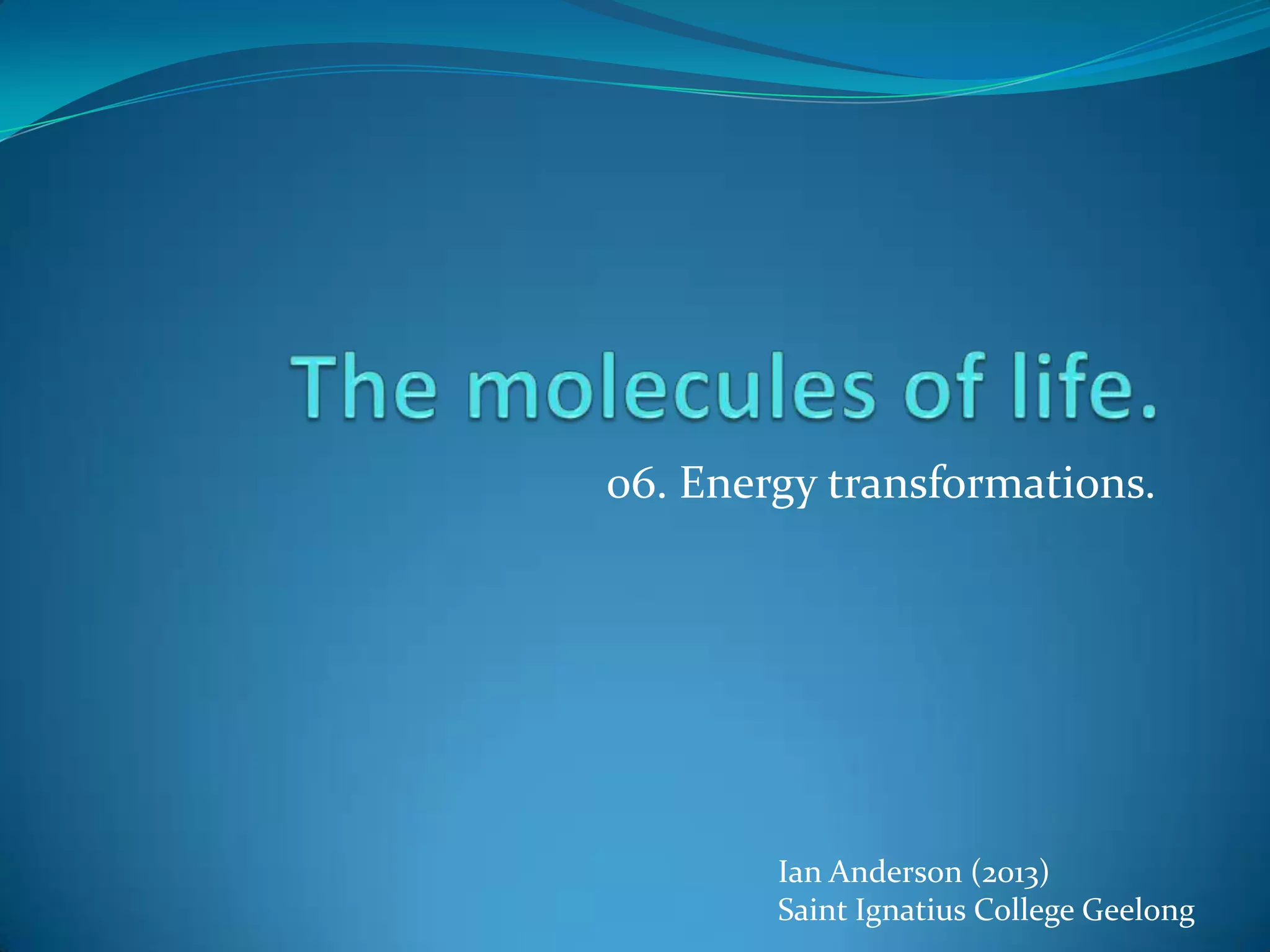 The document discusses energy transformations in living organisms. It explains that glucose is the main source of chemical energy for plants and animals. ATP is the energy currency of cells and is regenerated through cellular respiration. Cellular respiration can occur aerobically, using oxygen to produce more ATP, or anaerobically through fermentation without oxygen. Photosynthesis captures solar energy to convert carbon dioxide and water into glucose and oxygen. Plants have evolved C3, C4, and CAM pathways to photosynthesize that help conserve water in different environments.