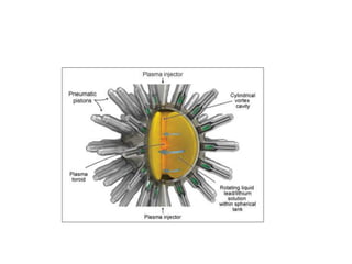 General Fusion raises $20 million to further develop its plasma confinement approach for fusion energy. The company aims to achieve fusion using synchronized pistons to set up shock waves in plasma at an estimated cost of $0.04 per kilowatt-hour. Several options for advancing energy production are discussed, including carbon sequestration, fission, and various fusion technologies like dense plasma focus devices. Multiple companies and research institutions around the world are conducting research into practical fusion energy production through different confinement approaches.
