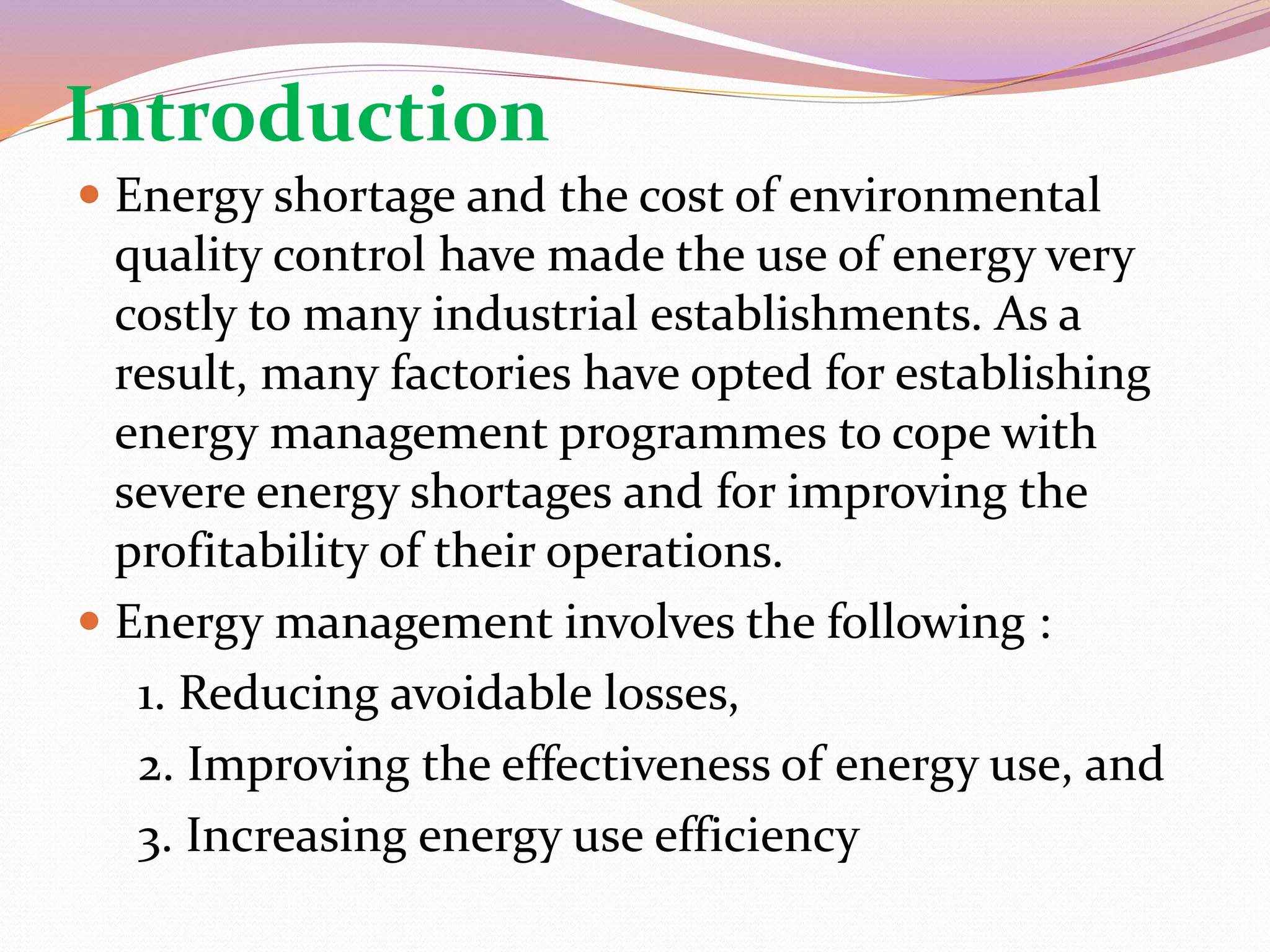 The document outlines the key aspects of conducting an energy audit for an industrial establishment. It defines an energy audit as the first step in an energy management program to identify conservation opportunities. The summary includes identifying major energy uses, opportunities for savings, conducting a cost-benefit analysis of opportunities, and developing an action plan to prioritize implementation. The overall goal of an energy audit is to assess current energy usage and efficiency to guide improvements that reduce costs.