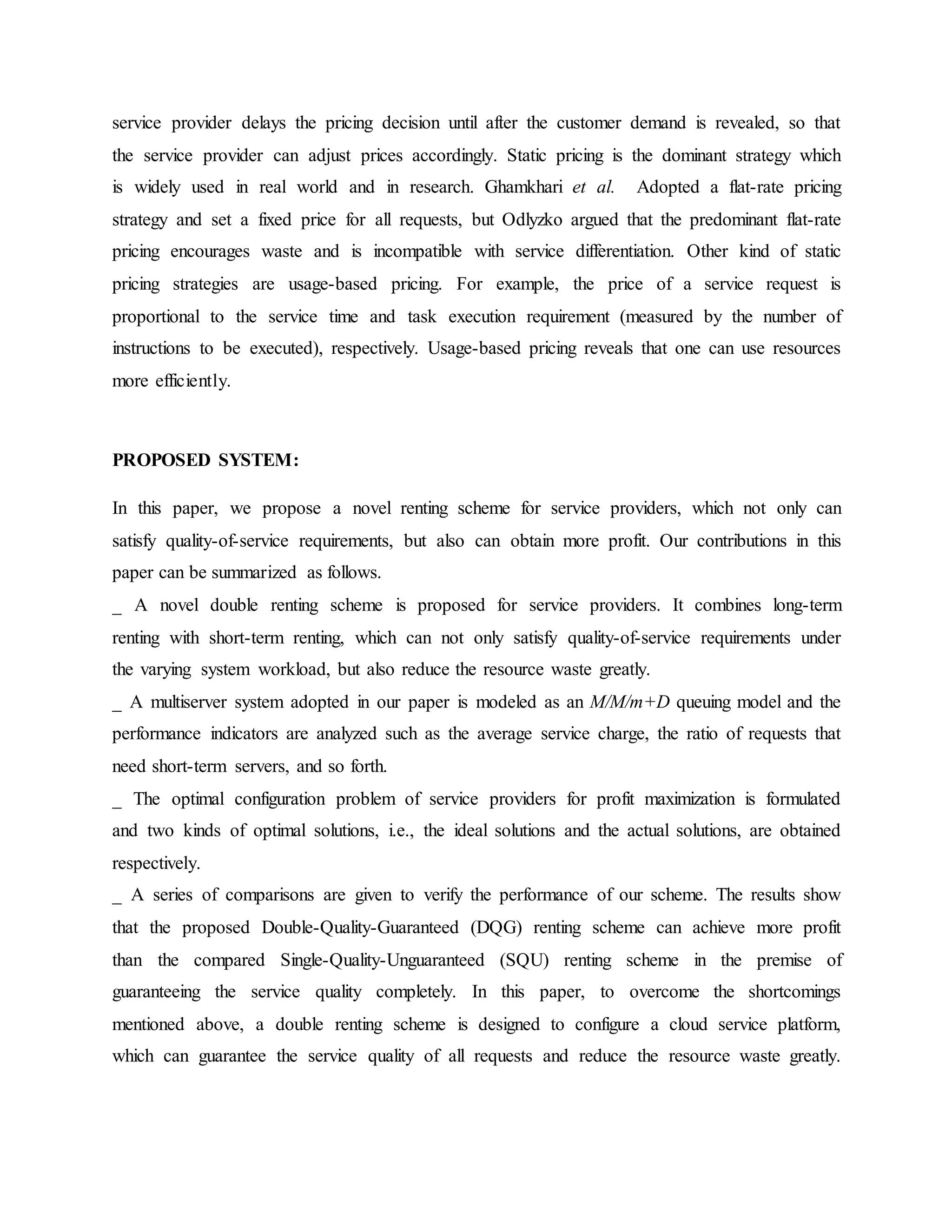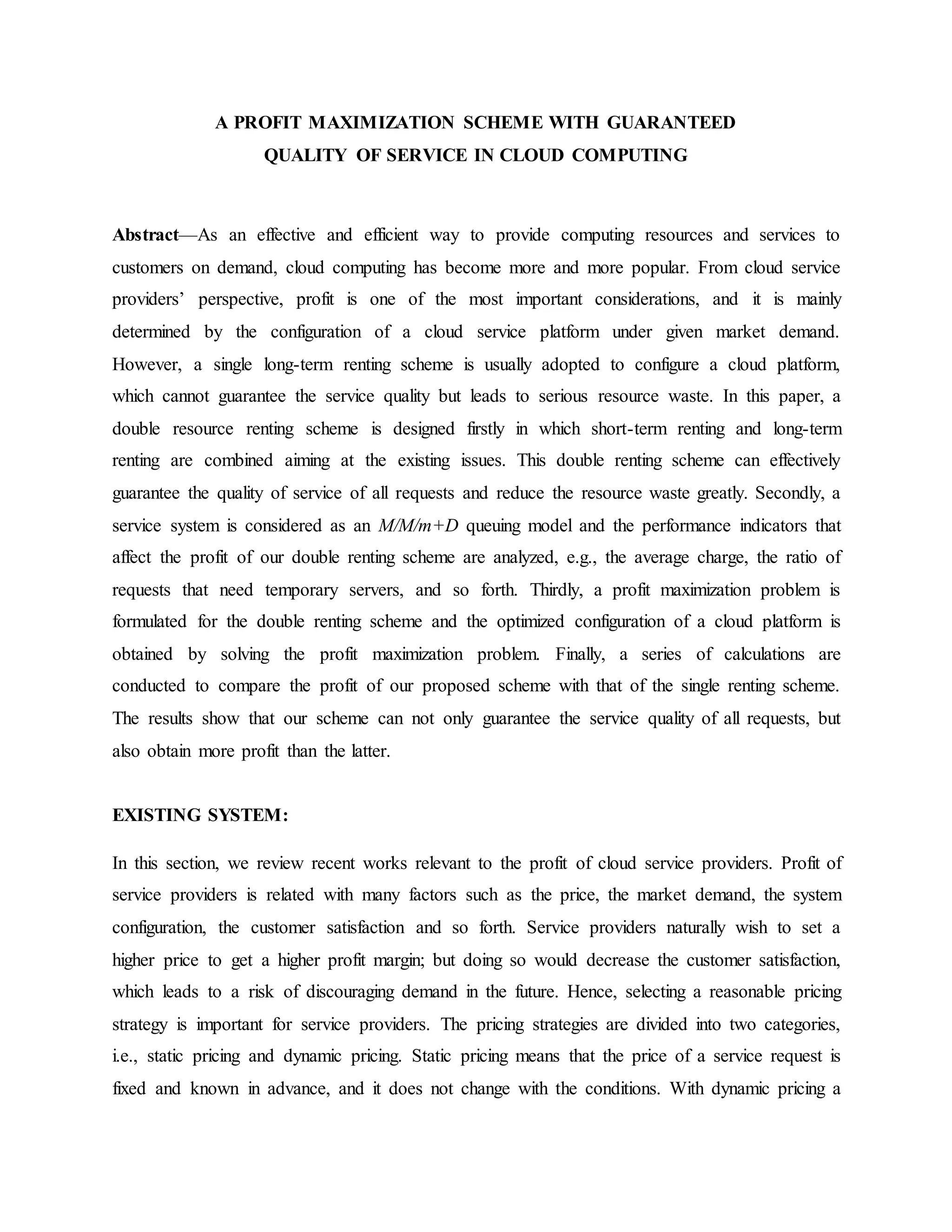 This document proposes a double resource renting scheme for cloud service providers to maximize profit while guaranteeing quality of service. It models the cloud system as an M/M/m+D queuing model. The scheme combines long-term and short-term server rentals to provide the necessary computing capacity over time. An optimization problem is formulated to determine the optimal server configuration that maximizes profit by balancing rental costs against increased revenue from meeting quality guarantees. Comparisons show the double renting scheme achieves higher profit than single renting while guaranteeing all requests are served on time.