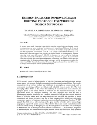 The paper proposes an energy-balanced improved leach routing protocol for wireless sensor networks (WSNs) that utilizes a k-mean clustered approach to enhance energy efficiency and network longevity. Traditional LEACH suffers from random clustering, leading to energy imbalance, which this new method addresses by optimizing cluster head selection based on node energy and location. The results demonstrate significant improvements in energy conservation and overall network performance compared to traditional LEACH protocols.
