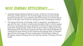 The document discusses the importance of energy efficiency in electrical systems and highlights various energy-efficient technologies, including motors, lighting controls, and transformers. It emphasizes the role of occupancy sensors and daylight harvesting in reducing energy consumption, as well as management practices like maximum demand controllers and automatic power factor controls. The content outlines the benefits and workings of these technologies and methods, demonstrating their potential for significant energy savings.