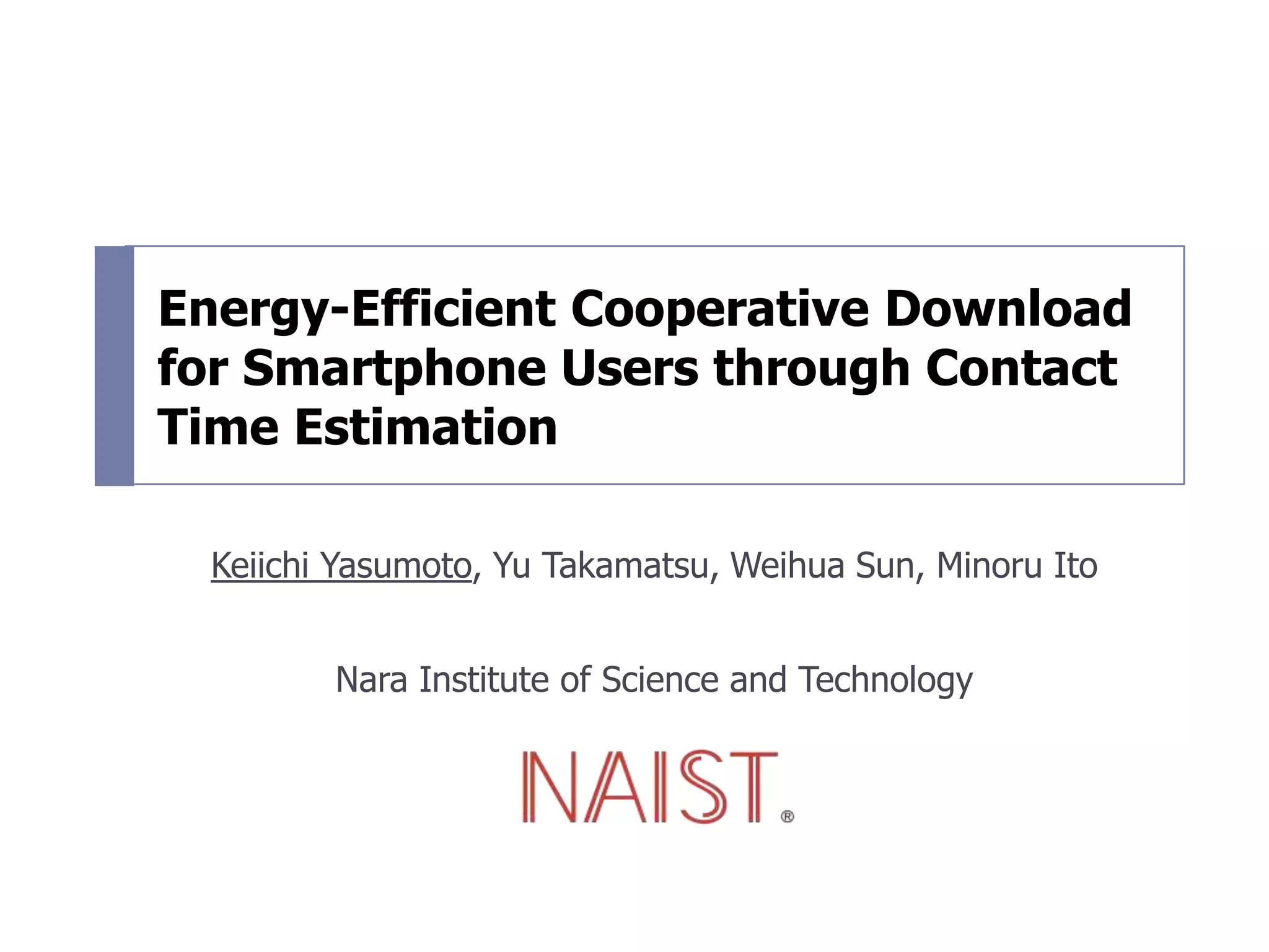 The document proposes an energy-efficient cooperative download method for smartphone users. The method uses a server to predict contact times and probabilities between users to construct contact tables. Users then schedule chunk acquisitions from other users and the cellular network based on the tables and chunk rarities. Experimental results show the method reduces cellular usage by 10-28% and battery consumption by 20-30% compared to always using short-range communication, while still completing downloads.