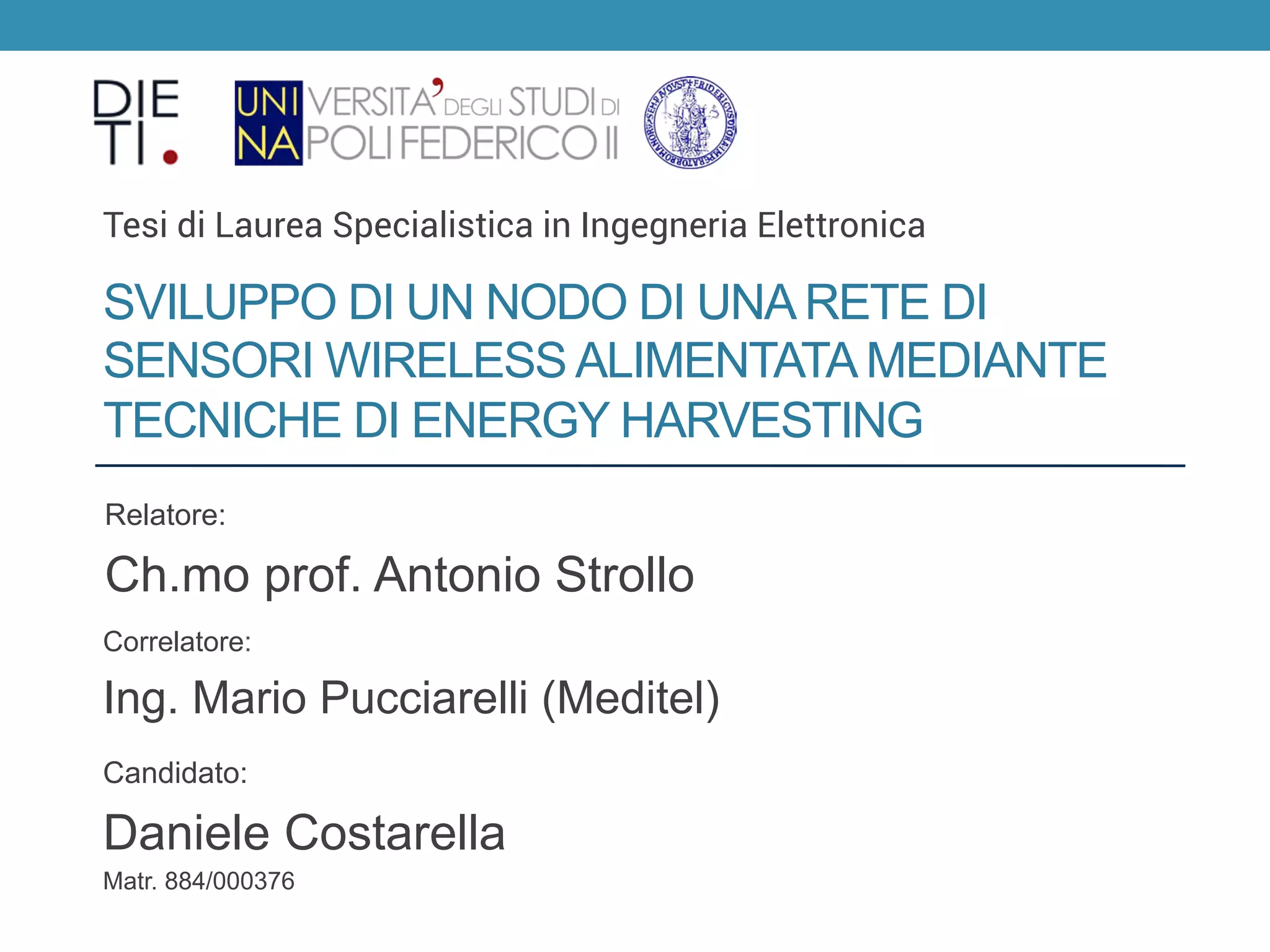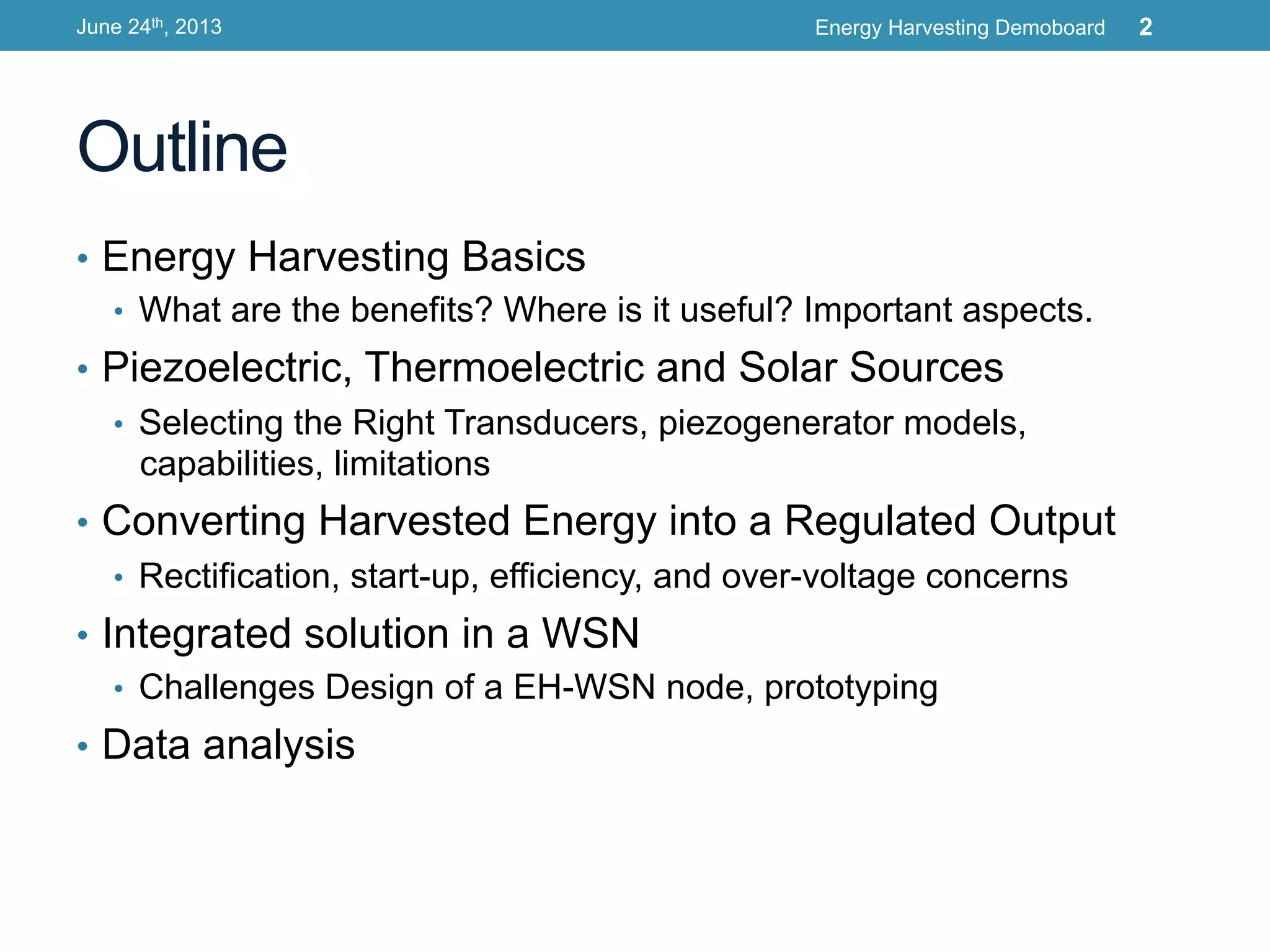 The document summarizes the development of an energy harvesting wireless sensor node powered by piezoelectric, thermoelectric, and solar techniques. It describes the design of a demo board with energy harvesting capabilities including an RF communication module and temperature sensor. The node is intended to operate with low power consumption in sleep mode and integrate energy from multiple ambient sources to power wireless transmission of sensor data for long-term remote monitoring applications.