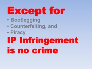 The document discusses the enforcement of intellectual property rights (IPR) in England, noting that unlike in continental Europe, the burden of enforcement falls on the owner, and litigation can be costly. It highlights the limited availability of 'no win, no fee' agreements for IPR cases and suggests considering IP insurance for owners. Additionally, it mentions alternative dispute resolution options like mediation and arbitration through various agencies, along with the option for copyright owners to join collecting societies.
