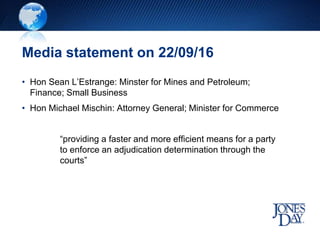 The document summarizes proposed changes to simplify and expedite the process of enforcing adjudication determinations in Western Australia. Currently, parties must seek leave from the relevant court to enforce a determination, which can cause delays. The proposed Construction Contracts Amendment Bill would remove this requirement, allowing parties to simply file and serve a certified copy of the determination and affidavit stating the outstanding amount. This is intended to make the enforcement regime more efficient while still allowing judicial review. The changes are expected to be introduced in late 2016 and early 2017.