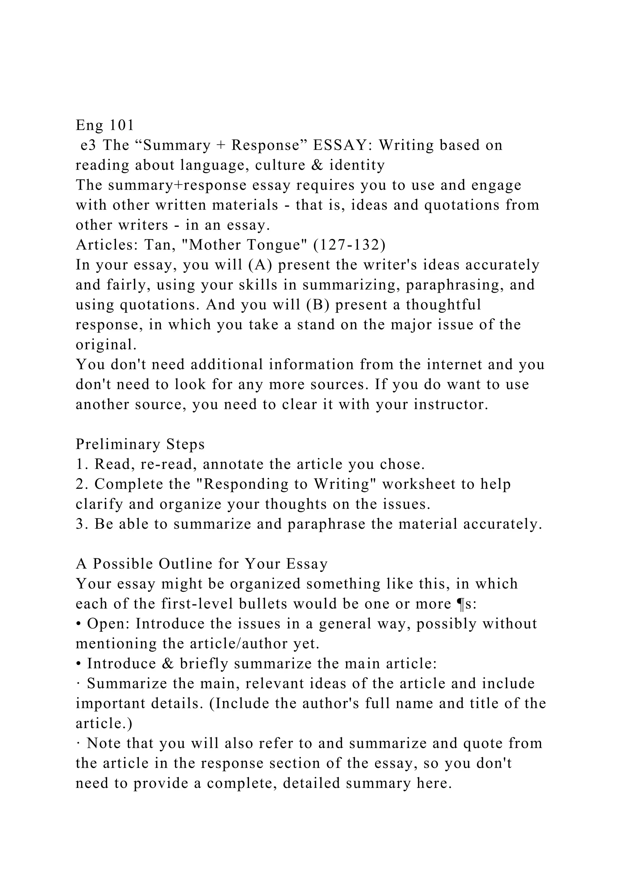 The document outlines the requirements for a 'summary + response' essay in an English course, focusing on engaging with other writers’ ideas while presenting a personal response. It emphasizes the importance of accurately summarizing and paraphrasing materials, organizing the essay effectively, and discussing relevant theories related to bullying. The document also highlights the significance of avoiding plagiarism and adhering to specific formatting guidelines.