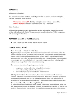 The document is a syllabus for an English 102 college writing course taught in the spring of 2017. It outlines the course description, learning outcomes, assignments including major papers, deadlines, expectations for class participation and preparation, grading criteria, and policies regarding plagiarism, disabilities, and repeating the course. The major assignments are a research topic proposal, annotated bibliography, research paper, and public statement, and students will complete regular process work to develop their major papers.