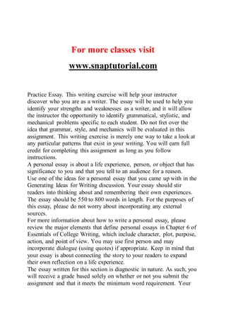 This document outlines the course content and assignments for ENG 121 Entire Course. It includes discussion questions, quizzes, essays and other writing assignments that are required throughout the 5 week course. The first week covers topics like reading strategies, generating essay ideas, and includes a practice essay. Students are given feedback on their writing to help identify strengths and weaknesses. The course aims to improve students' skills in areas like structure, style, grammar and more. Subsequent weeks focus on additional writing assignments, peer reviews, and revising drafts to completion.
