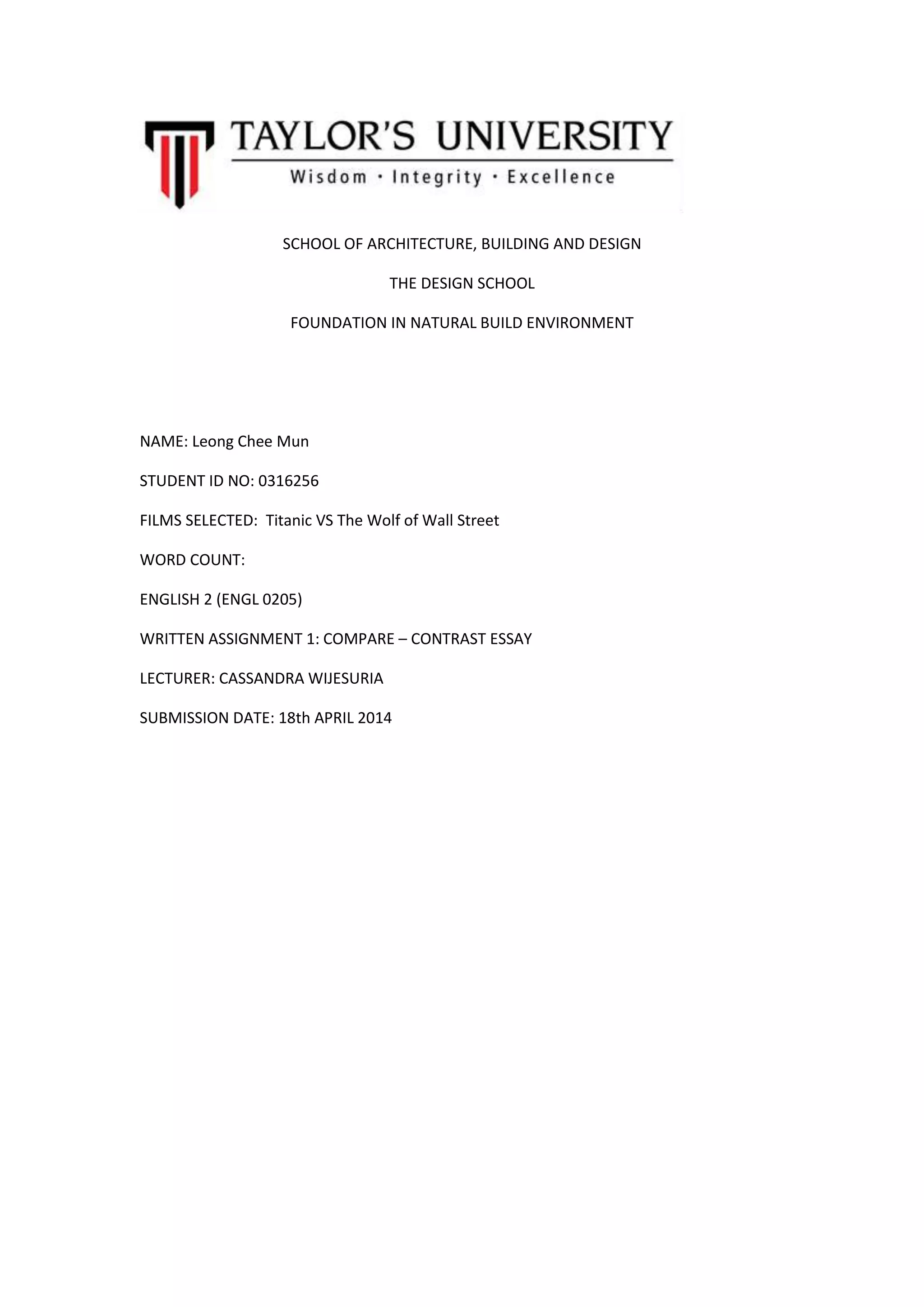 This document provides a compare and contrast essay analyzing the films Titanic and The Wolf of Wall Street, focusing on the main characters, themes of love, occupations, and allies. It discusses how the lead character Rose in Titanic is unhappy with her life but cares for others, while Jordan in Wolf is a playboy who betrays his wives. Both films explore love, but Titanic shows familial and romantic love while Wolf depicts the love of money. Jack is a nude artist while Jordan runs an illegal stock broker firm. Jack's allies help him escape the sinking ship, while Jordan's ally teaches him drug abuse.