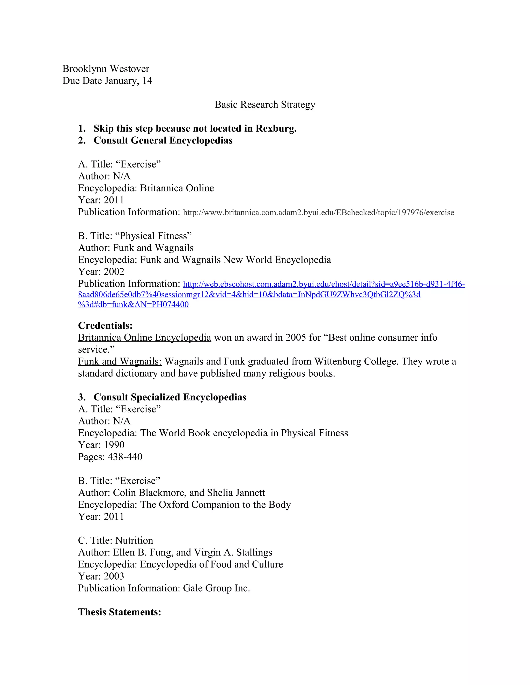 This document outlines Brooklynn Westover's basic research strategy on the topic of exercise and nutrition. It includes searching general and specialized encyclopedias, books, periodical articles, internet sources, and statistics. The strategy involves consulting sources from Britannica Online, Funk and Wagnails New World Encyclopedia, The World Book Encyclopedia, The Oxford Companion to the Body, Encyclopedia of Food and Culture, the ACSM Fitness Book, Fitness and Wellness, the Journal of Sport and Exercise Psychology, the American Journal of Medicine, and websites keepingfit.com and reintegration.com. Thesis statements proposed discuss how exercise and nutrition are important for health and happiness.