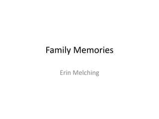 This document is a collection of memories from Erin Melching about her large extended family. It discusses fond memories of family vacations spent at her Uncle's lake house in South Carolina where the 17 family members bond on the lake. It also talks about positive relationships and memories Erin has with her sister Leah and their involvement in theater together, her funny younger brother, her loving grandparents who are a constant support, her close cousins Sydney and Ava and godson Will, and her parents who she has an open relationship with despite some rough patches. The document ends discussing Erin's puppy Lucy who has been a part of the family for 5 years and is always there for Erin.