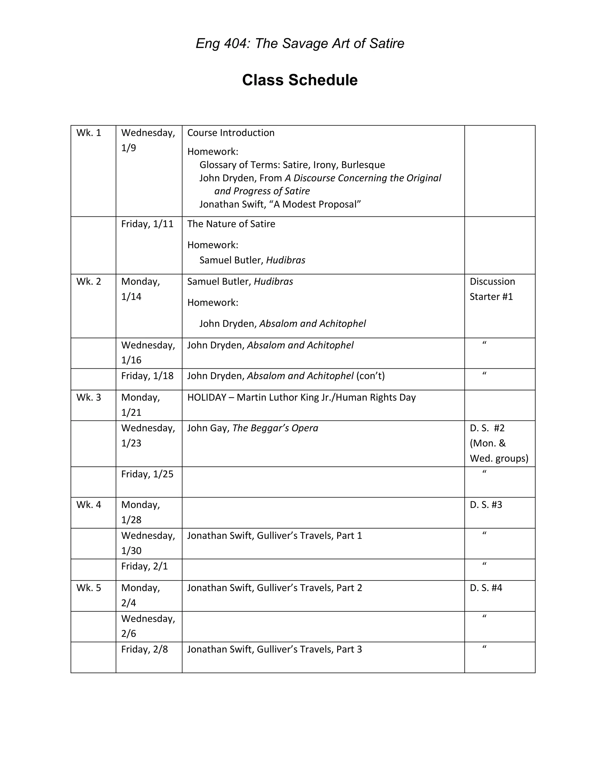 This document outlines the class schedule for Eng 404: The Savage Art of Satire over 5 weeks. It includes assigned readings for each class such as works by Dryden, Swift, Butler, and Gay. Students will read seminal satirical works and discuss them in class as well as complete 4 discussion starters over the course of the term. The schedule provides an overview of the key satirical works that will be examined in the class.