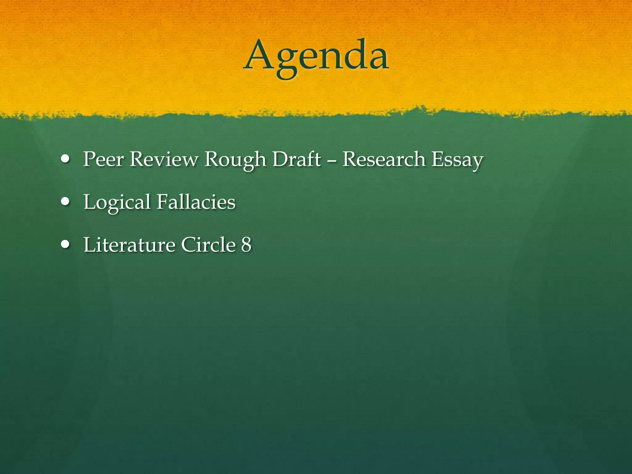 This document outlines an English class agenda that includes peer reviewing rough drafts of research essays, discussing logical fallacies, and having a literature circle discussion. It then provides a detailed explanation of 12 common logical fallacies: ad hominem, begging the question, false cause, post hoc ergo propter hoc, either-or fallacy, evasion, false analogy, oversimplification, rationalization, red herring, slippery slope, and two wrongs make a right. Examples are given for each fallacy and students are instructed to analyze arguments for logical fallacies.