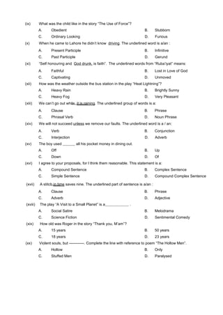 This document is the answer sheet for an English compulsory examination for HSSC-I (Higher Secondary School Certificate Part 1). It contains 20 multiple choice questions to be answered in 25 minutes on sections of literature, grammar, vocabulary and comprehension. The questions cover topics like synonyms, authors, spellings, parts of speech, literary devices and comprehension of short stories, poems and plays discussed in the exam.
