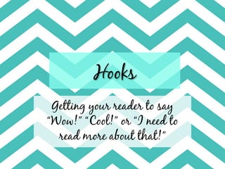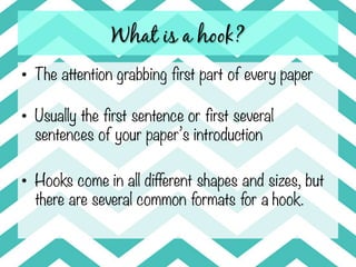 This document discusses different types of hooks that can be used at the beginning of a paper's introduction to grab the reader's attention. Some common hook formats include using a quotation, leading question, anecdote, fun fact, or analogy. Each hook type is meant to provoke the reader's interest and make them want to keep reading the paper. Examples are provided for each hook format to illustrate how it can be effectively implemented.