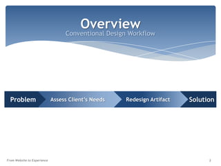 The document discusses redesigning the digital space of an English department's website using a user-centered design approach. It describes conducting stakeholder interviews, analyzing competitor websites, inventorying existing content, card sorting exercises to define site sections, wireframing, prototyping, and usability testing an interactive mockup. The results of this process included reorganizing content into more logical sections, addressing usability issues, and developing standardized templates for different page types to create a more effective online experience for users.