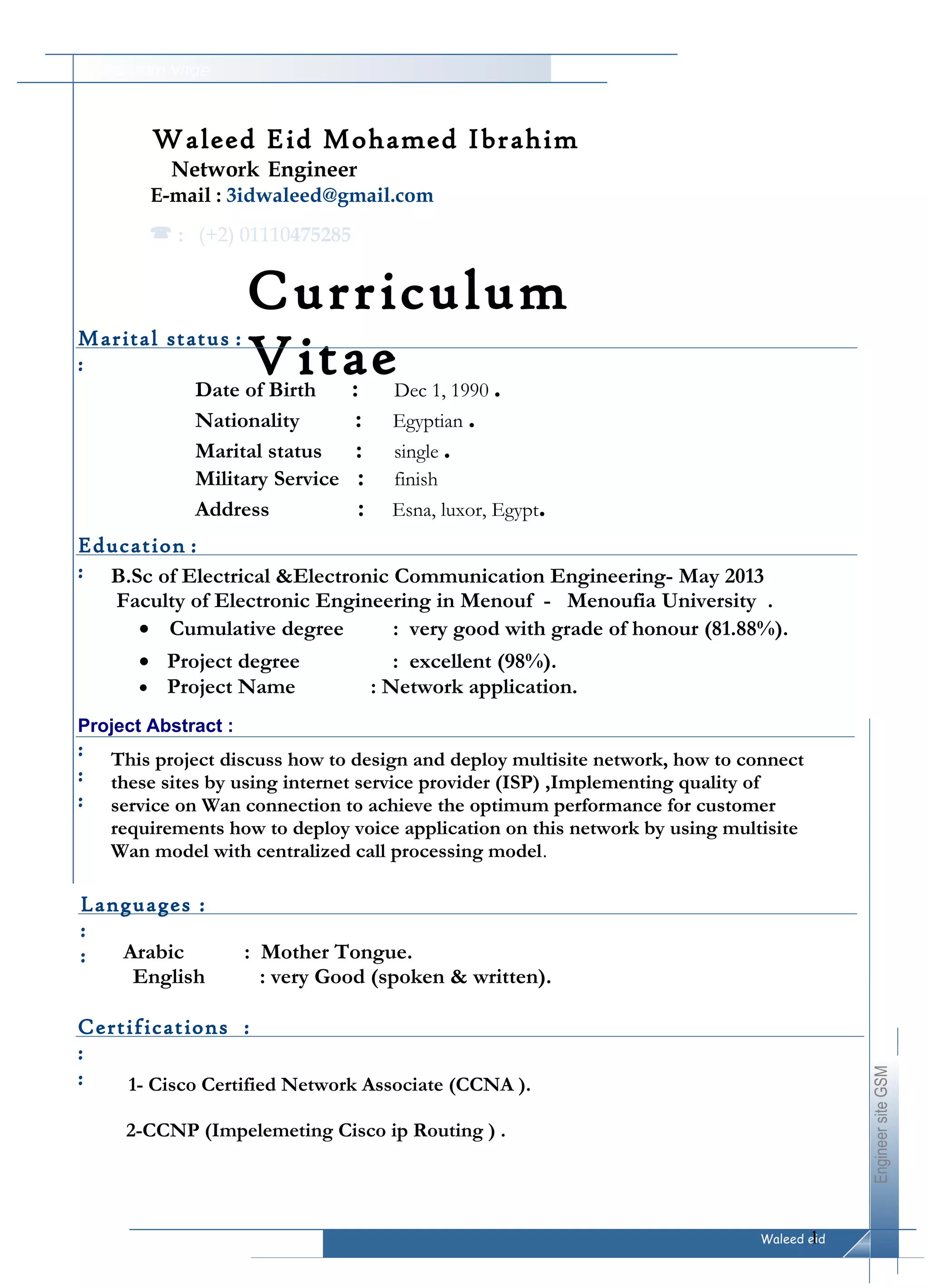 Waleed Eid is an Egyptian network engineer seeking new opportunities. He has a B.Sc in Electrical and Electronic Communication Engineering from Menoufia University with excellent grades. His project focused on designing and deploying a multisite network using an ISP to provide quality of service and centralized call processing. He is fluent in English and Arabic with certifications in CCNA, CCNP, and Cisco voice technologies. Waleed has experience in programming, office software, and both Windows and Linux operating systems. He is highly presentable, able to work independently and in teams, and willing to travel as needed.