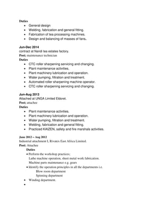 This document is a curriculum vitae for Edwin Kipchumba Rotich. It outlines his educational background which includes a Bachelor's degree in Mechanical and Production Engineering from Moi University. It also details his professional experience which involves roles in fabrication, maintenance, and operations at various companies. Finally, it lists his technical skills in Autodesk Inventor and computer applications as well as his hobbies and references.