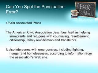 This document contains tips and examples about spelling, wording, punctuation and proofreading. It discusses identifying punctuation errors in news articles, the importance of spelling and word choice, and how a small word change can significantly alter meaning. The document also provides links to resources on proofreading articles faster, tips for self-proofreading, and having others proofread work while still double checking it.