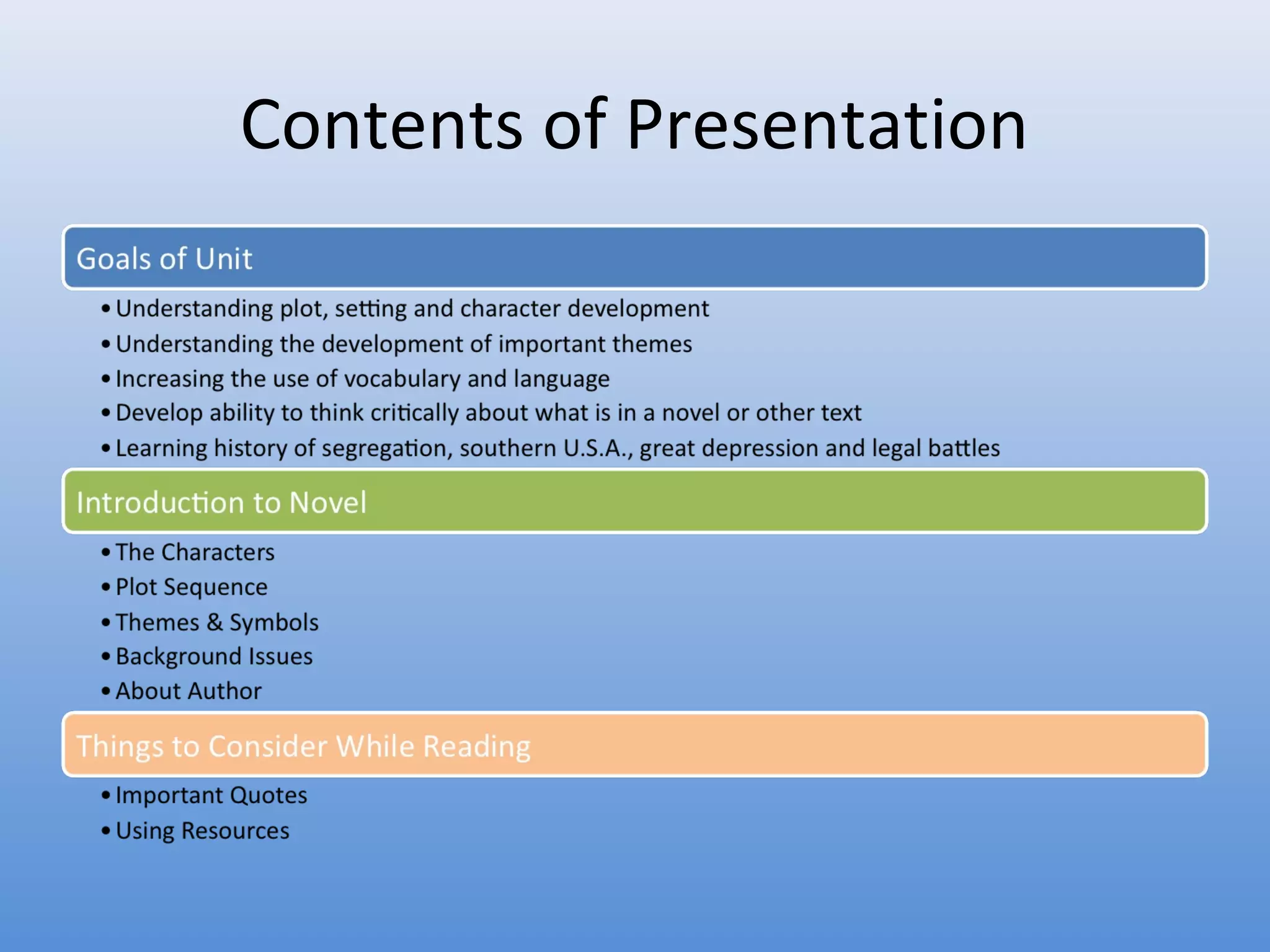 This document provides an overview and introduction to the novel To Kill a Mockingbird. It outlines the goals and topics that will be covered in the unit, including plot, setting, character development, theme, vocabulary, critical thinking, and historical context. It then gives a brief introduction to the main characters, plot, themes, symbols, background information on the Great Depression and Jim Crow laws, and notes about the author Harper Lee. Students are provided with discussion questions and resources to help them understand and analyze the novel.