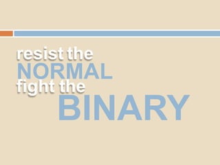 This project examines how queer-identified individuals construct their identity through language used on blogs. Specifically, it analyzes 4 blogs that discuss queer labels, gender presentation, and identity. The blogs grapple with defining "queer" and navigating heteronormativity. Bloggers explore identity through non-binary gender expressions, rejection of "menswear/womenswear" dichotomies, and redefining terms like "fashionista." They also discuss struggles with labels, passing as cisgender, and presenting queer identity visually. The analysis shows how bloggers use language to perform and understand queer identities that resist mainstream norms.
