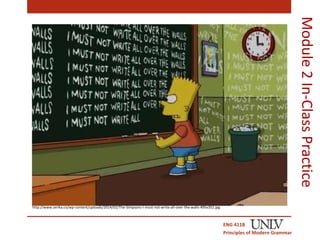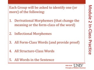This document contains instructions and practice materials for an in-class grammar exercise. It divides students into groups and assigns each group to identify different grammatical elements in sentences. Examples of sentences are provided for each group to analyze. The document also includes some additional challenging "stumper" sentences for further practice.