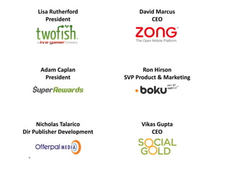 The document discusses monetization strategies for social games and apps, emphasizing simplicity and effective user engagement through clear calls to action and balanced gameplay. It highlights the importance of integrating payment options thoughtfully and creatively, catering to specific audience demographics. The panel also addresses issues like fraud and the need for varied payment methods to ensure a positive user experience.