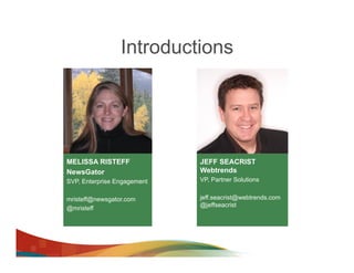 This document summarizes an enterprise collaboration presentation by Melissa Risteff of NewsGator and Jeff Seacrist of Webtrends. The presentation discusses the rise of social enterprises and the importance of employee engagement, adoption, and measuring collaboration efforts. It also outlines how NewsGator and Webtrends can help organizations improve social collaboration, track key metrics, and build measurement strategies to understand and enhance their social initiatives.