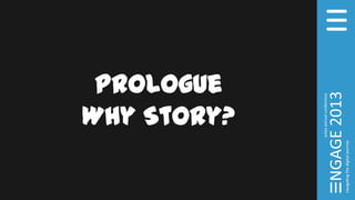 This document discusses how storytelling principles can be applied to user experience design. It begins by establishing the universal power of stories and how humans are wired to consume them. It then outlines the basic elements of story - character, setting, and plot - and maps them to UX design concepts like persona, presentation trends, and user flows. The document uses the framework of a three act story structure to explore current trends in areas like responsive design, content strategy, and visual style. It emphasizes that an effective online experience tells a compelling story that immerses the user through a deep understanding of character needs and a well-crafted narrative across the design.