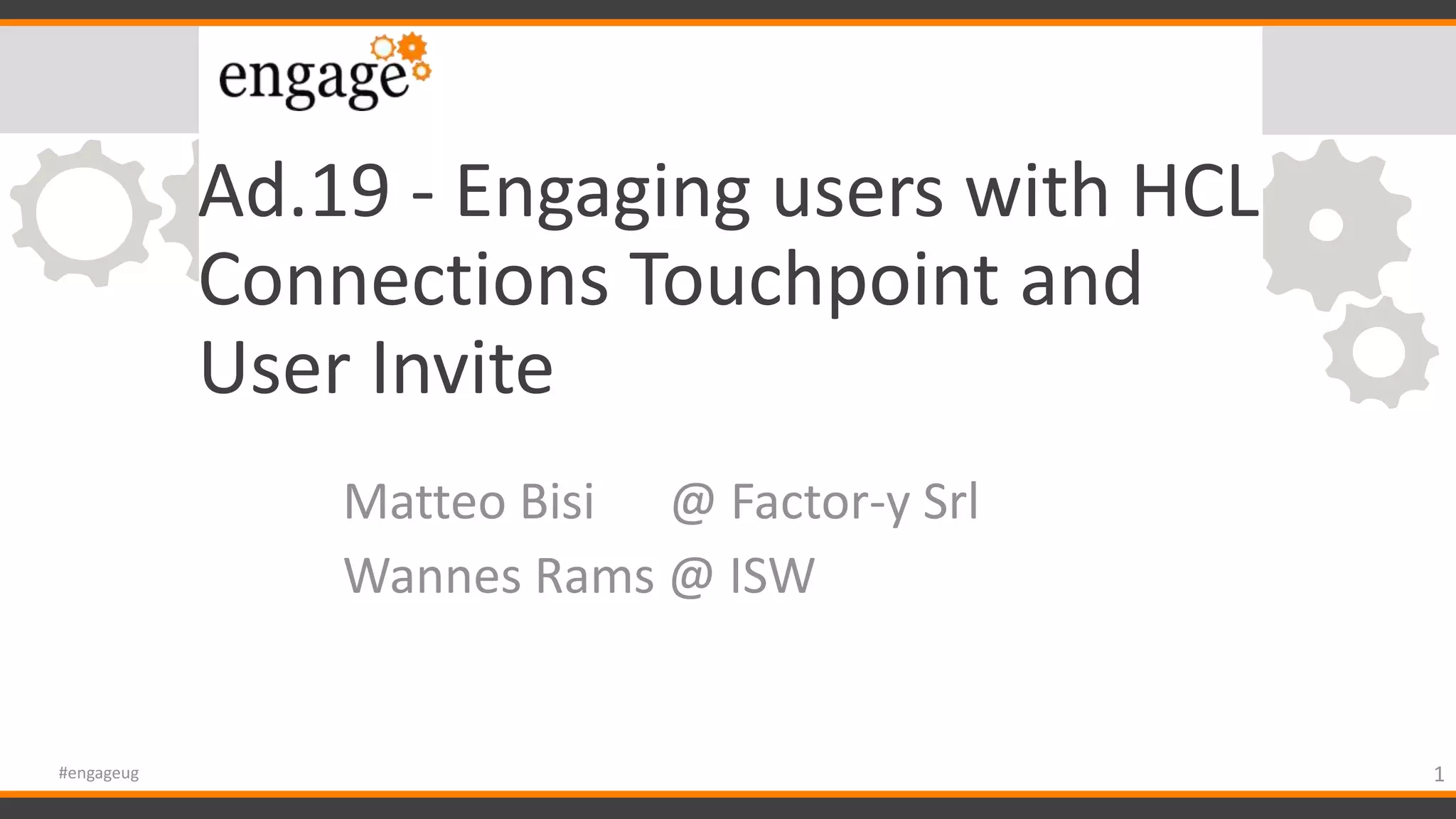 The document outlines a presentation on engaging users with HCL Connections Touchpoint and user invitations, led by Matteo Bisi and Wannes Rams. It discusses the latest version of Touchpoint, installation, configuration, and usage tips, as well as the process for inviting external users and the necessary configurations related to LDAP. Additional resources like privacy guidelines and customization options are also mentioned for enhancing user experience.